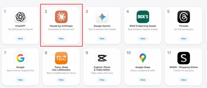 Claude冲上苹果免费榜第二!AI圈新王炸来了,ChatGPT遭遇劲敌